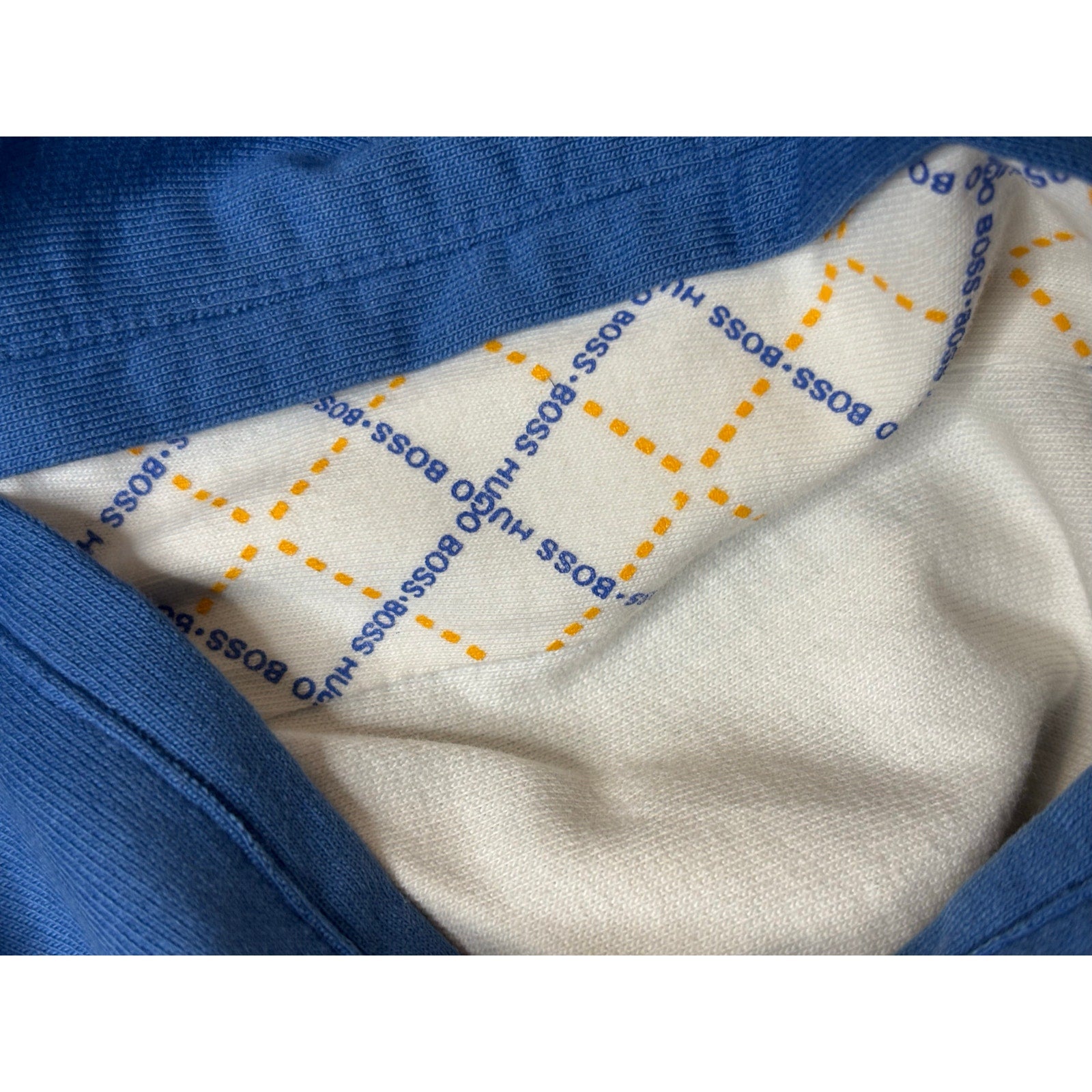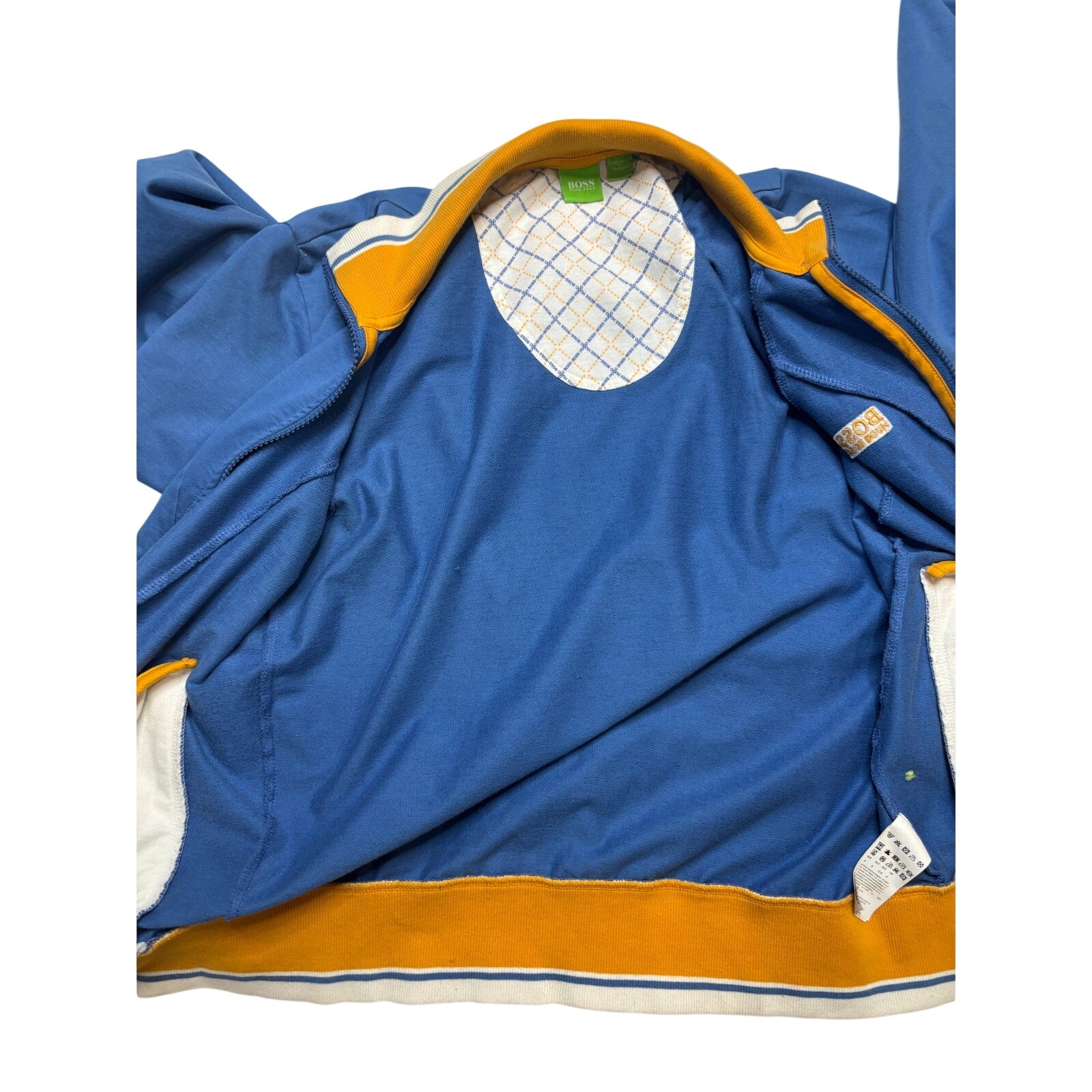 Classic Hugo Boss full-zip jacket in blue with contrast trim. Features embroidered BOSS Hugo Boss logo on the chest, ribbed hem and cuffs, stand collar with contrasting interior, and zip front closure. Soft interior with branded pattern. Great everyday casual piece suitable for layering.