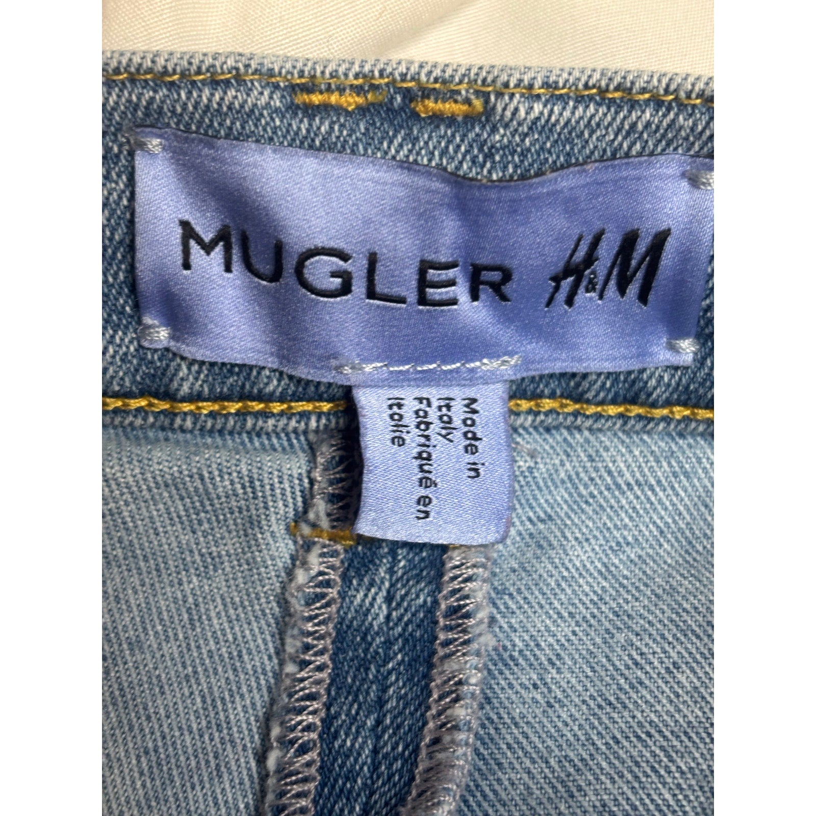Architectural Mugler x H&M sculpted panel jeans featuring Mugler’s signature curved seam construction and contrast black inserts. Designed to contour and enhance the silhouette with a bold, futuristic edge inspired by Mugler runway aesthetics.